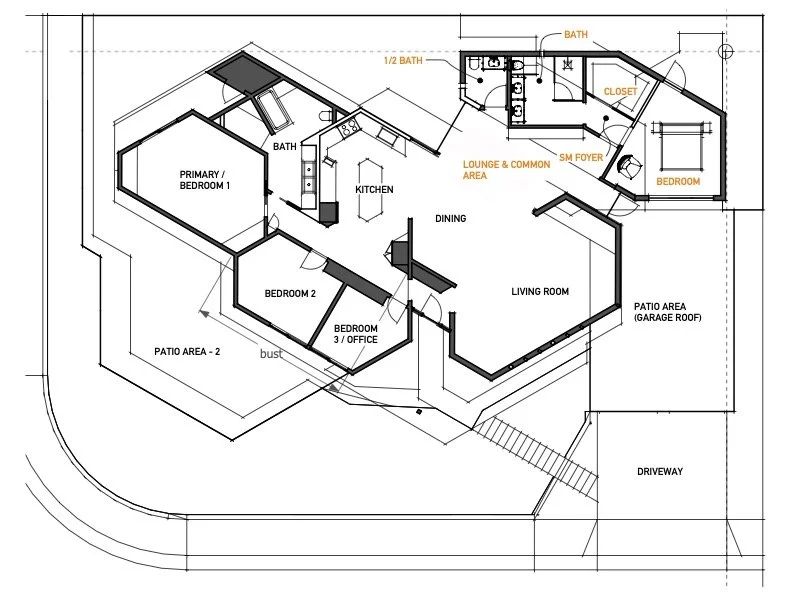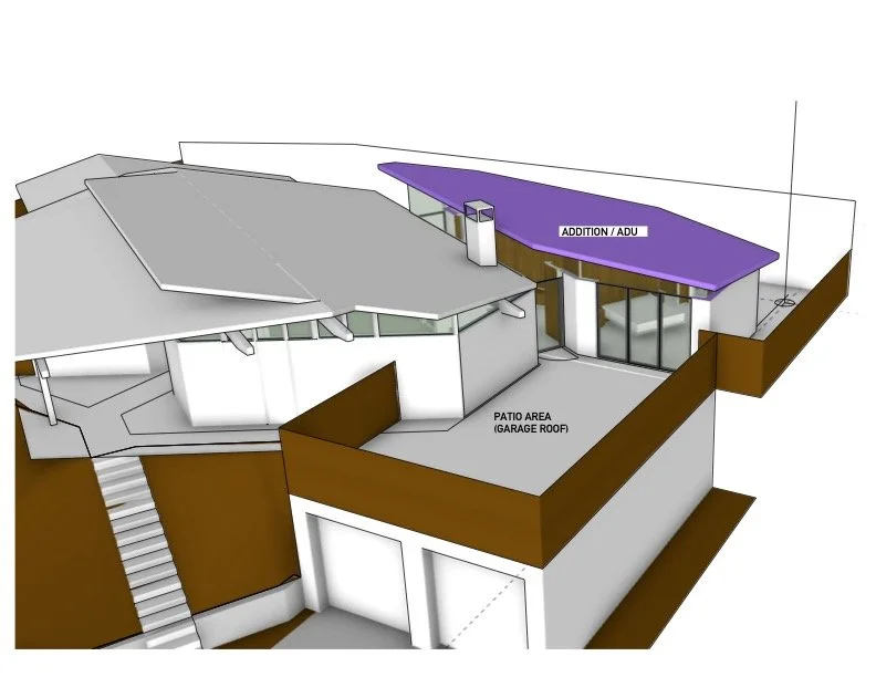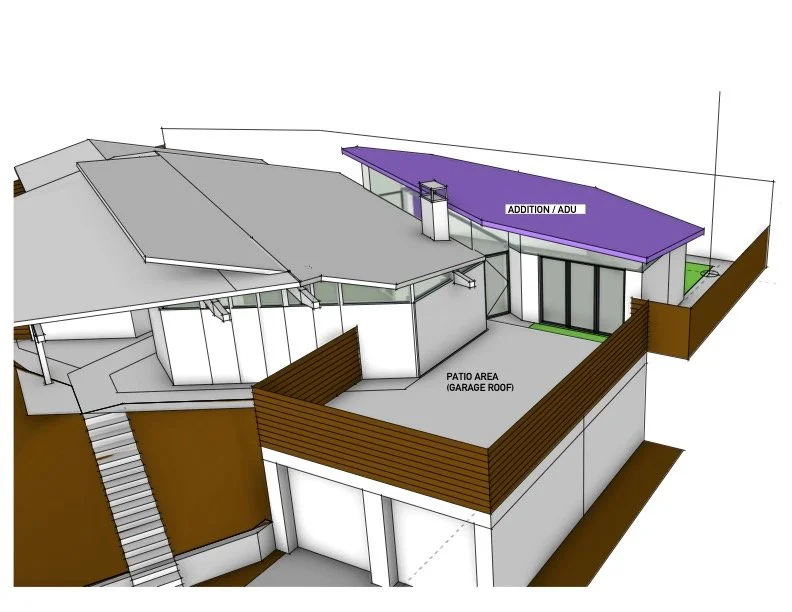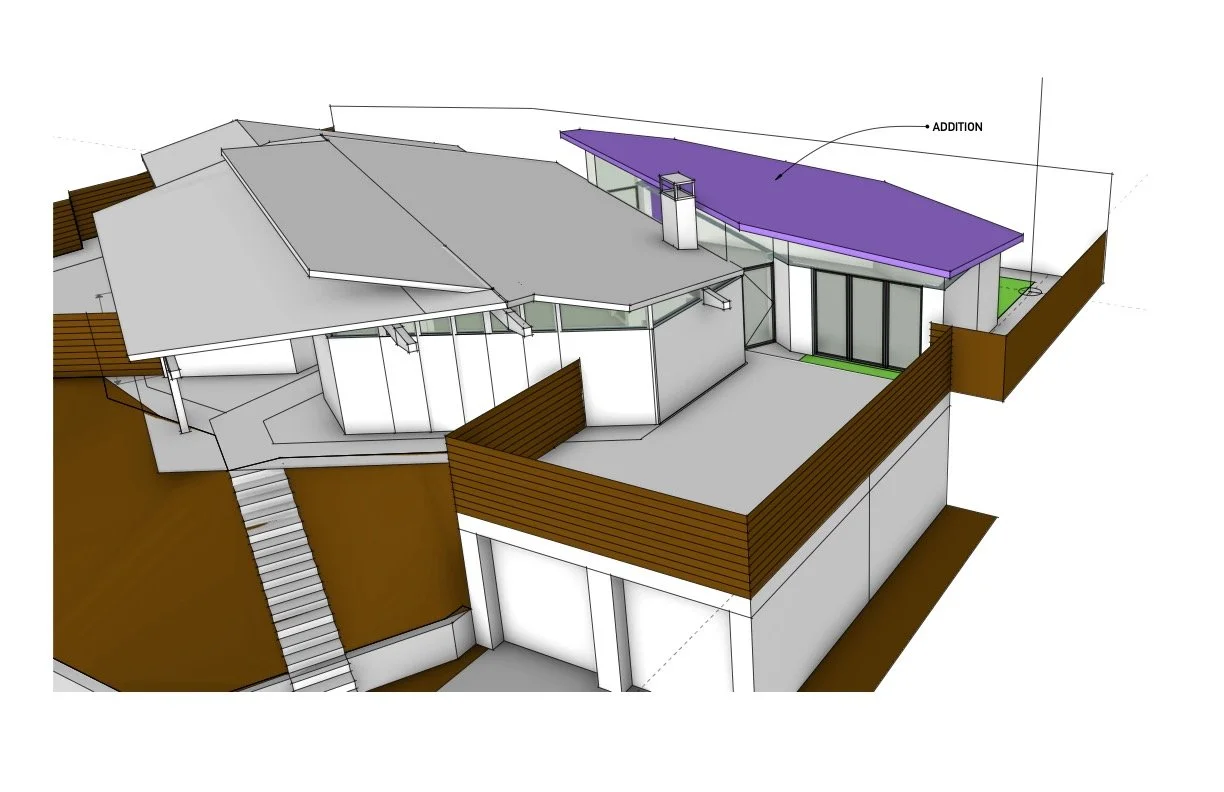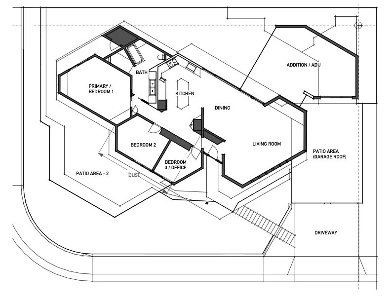 Summary: 2 Littlewood was a Study and Schematic Design that looked into expanding the small footprint of a very special mid-century modern house. The design team specifically looked into an addition in the backyard and interior modifications to the kitchen and bath. The series of designs went through the process of trying to best understand both geometry and best use-case for the owners. The existing home itself was very unique and required significant design effort to make the new structure match and accentuate the existing design. The original design was a model home from the world’s fair, and very distinct, designed with a hexagonal floorpan geometry, the angles informing the rest of the design, and creating distinct pattern that had to be followed in any new design. One challenge was working with the existing structure, which was not up to current codes and any modification to the structure would trigger significant structural modification and retrofitting beyond the designed work. The outcome was a structural separated structure, and a sealed, connected enclosure at the roof overlap and the walls. The study and the schematic designed looked at geometry first and then fit a variety of schematic uses within those geometries.